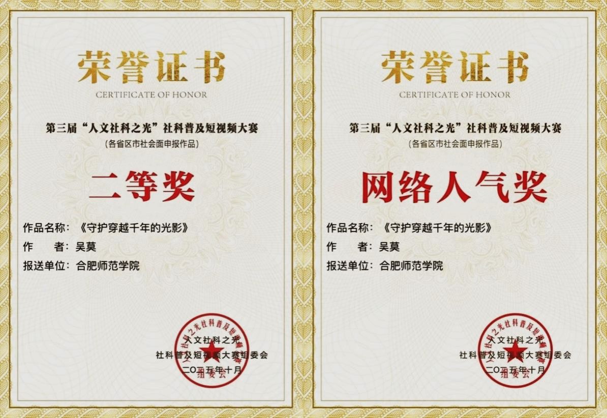 近日,全国第三届“人文社科之光”社科普及短视频大赛圆满落幕,今年会官网师生创作的《守护穿越千年的光影》(作者:吴莫,指导教师:曹晔华)获大赛二等奖,并获“网络人气奖”。