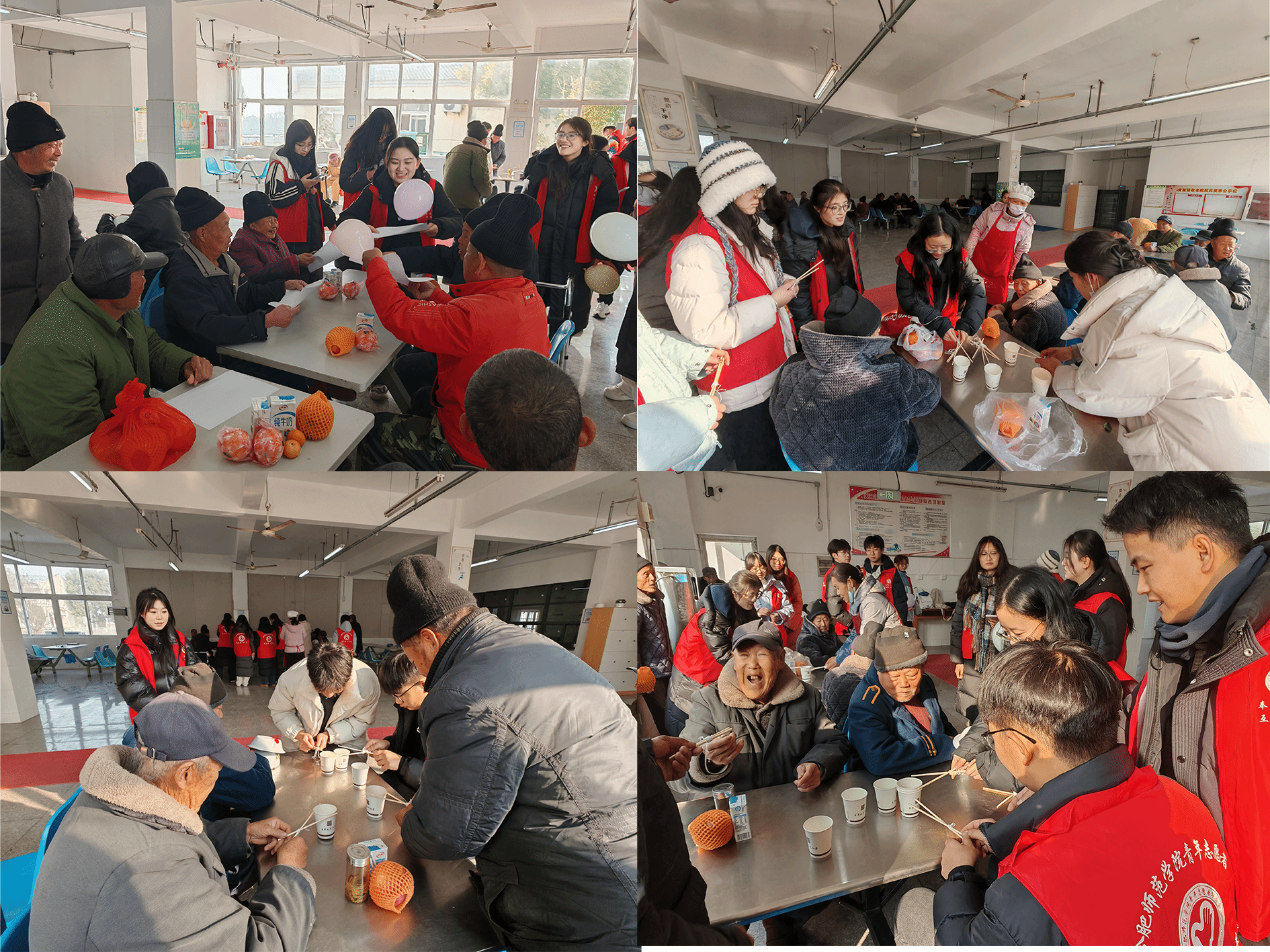 打扫完园区卫生,志愿者们在敬老院食堂为老人们带来精心准备的节目表演和互动小游戏。志愿者们为老人分发带来的瓜果、牛奶,便开始了节目表演。有悠扬的歌声、优美的舞蹈,还有气势豪迈的双截棍秀,每一个节目都赢得了老人们的热烈掌声。志愿者们用真挚的情感和精彩的表演,为老人们带来了一场视觉与听觉的盛宴。2人协力夹纸杯和多人传送气球等小游戏,也给老人们带去美好欢乐时光。