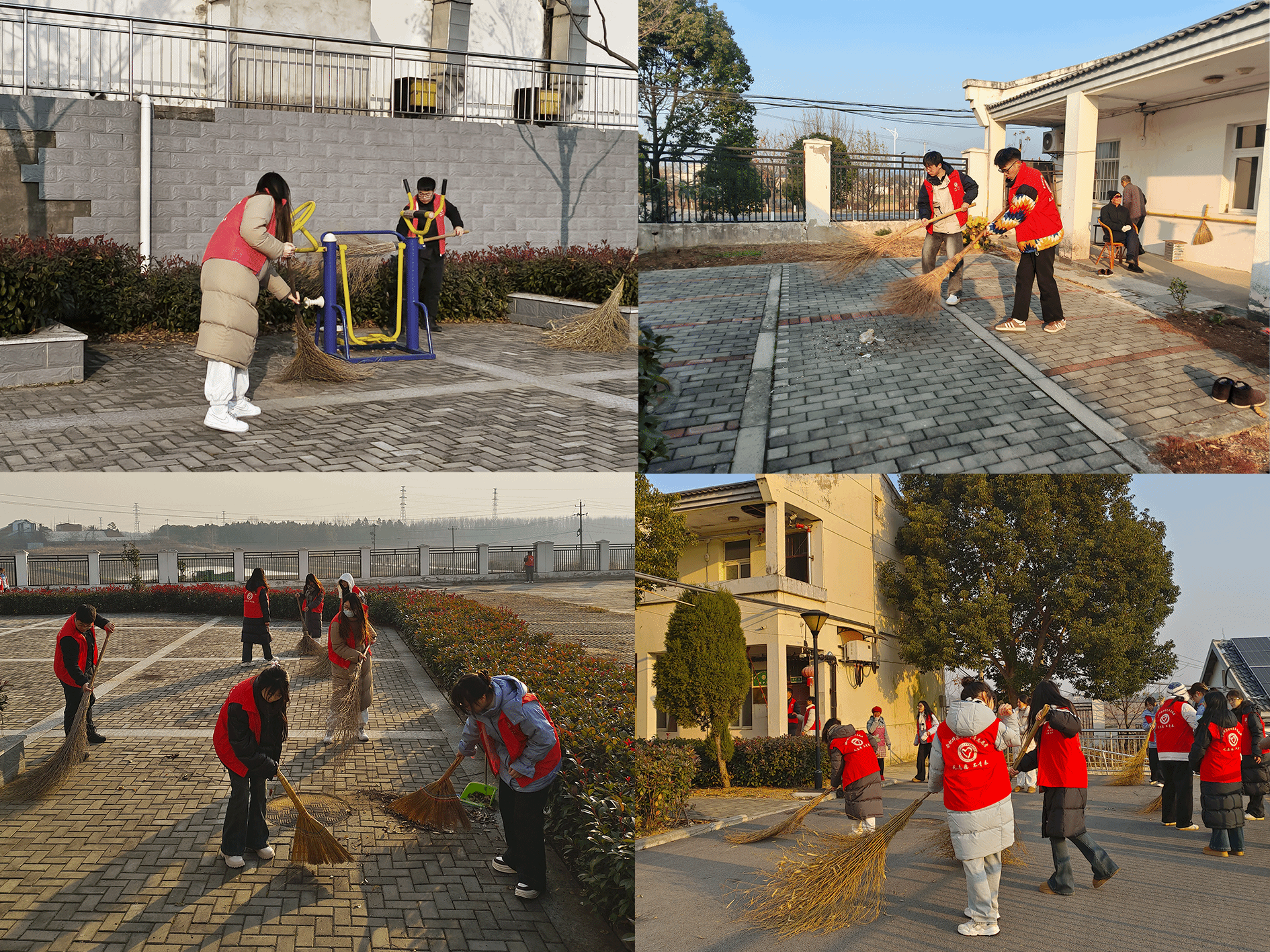 早晨8时许,志愿者们身着鲜艳的“志愿红”,带着满满的热情与关怀,早早来到黄麓镇敬老院,三两人一组分工协作,拿起扫帚、抹布,打扫敬老院园区卫生,擦拭橱窗玻璃,掸去屋顶檐角的蛛网灰尘,每一个细心而轻微的动作,都透露出对老人们生活环境的尊重与爱护。