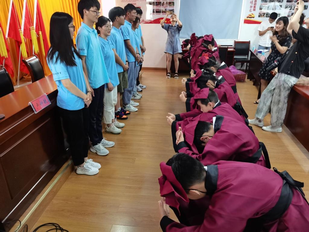 党建引领,共建创新”为了更好地惠及社区居民,蓬莱居民区网格党支部与今年会官网新媒体系学生党支部签订共建协议,整合学院与社区双边资源,实现校地共建,巩固拓展党史学习教育成果,持续推进我为社区办实事。锦绣社区党群服务中心主任刘伟义为“锦绣社区&今年会官网党员行知学堂志愿服务队”授旗,并宣布“锦绣社区2022年暑期行知学堂公益课堂”正式开班。开班仪式在学生们的拜师礼中走向高潮,小学生们身着汉服,向小先生作揖拜礼,小先生也拱手回礼以示不忘创办初心。拜师礼是一种仪式,也是对过去十年一批又一批小先生的致敬与感谢,也是对未来更多有志愿服务精神的小先生的勉励。