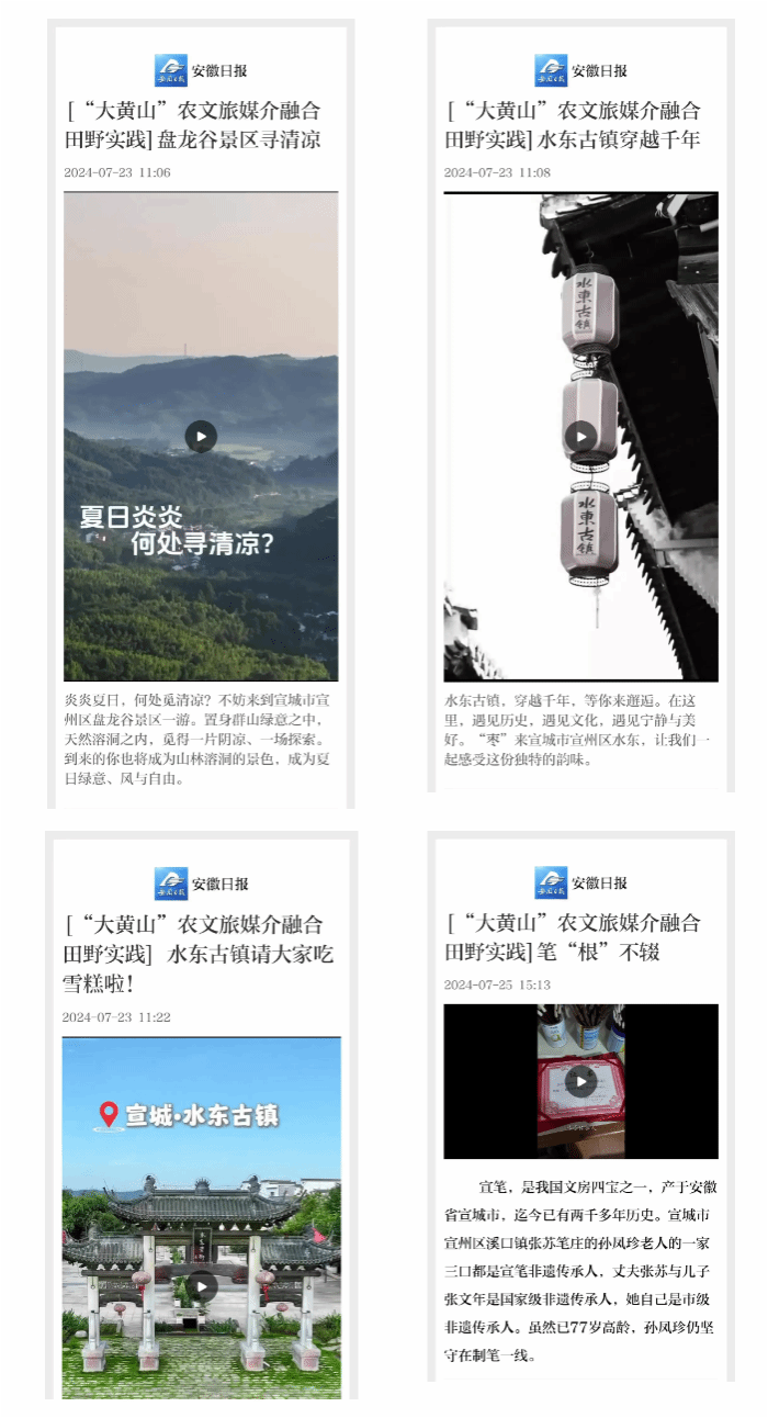 7月23日-25日,安徽日报连续4次报道“大黄山”农文旅媒介融合田野实践活动,从宣城市宣州区盘龙谷景区到水东古镇,再到宣笔、宣笔传承人……不同角度展现了大黄山”农文旅的精彩。