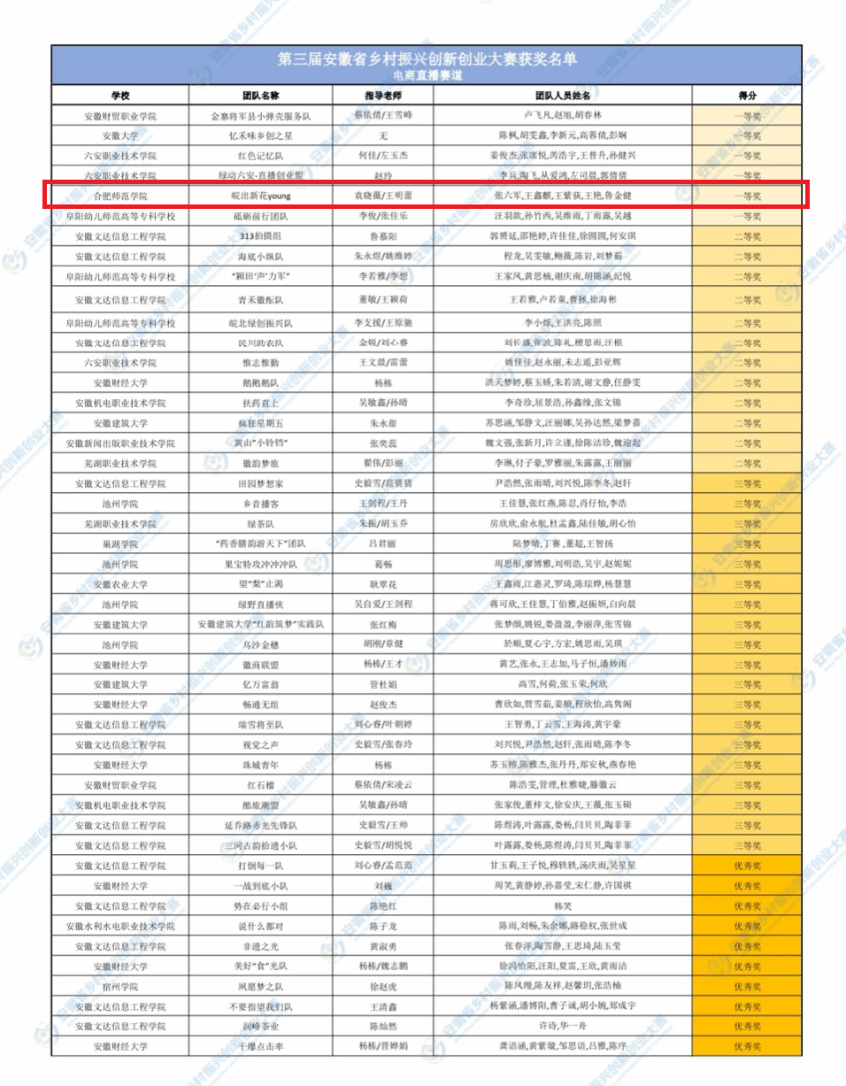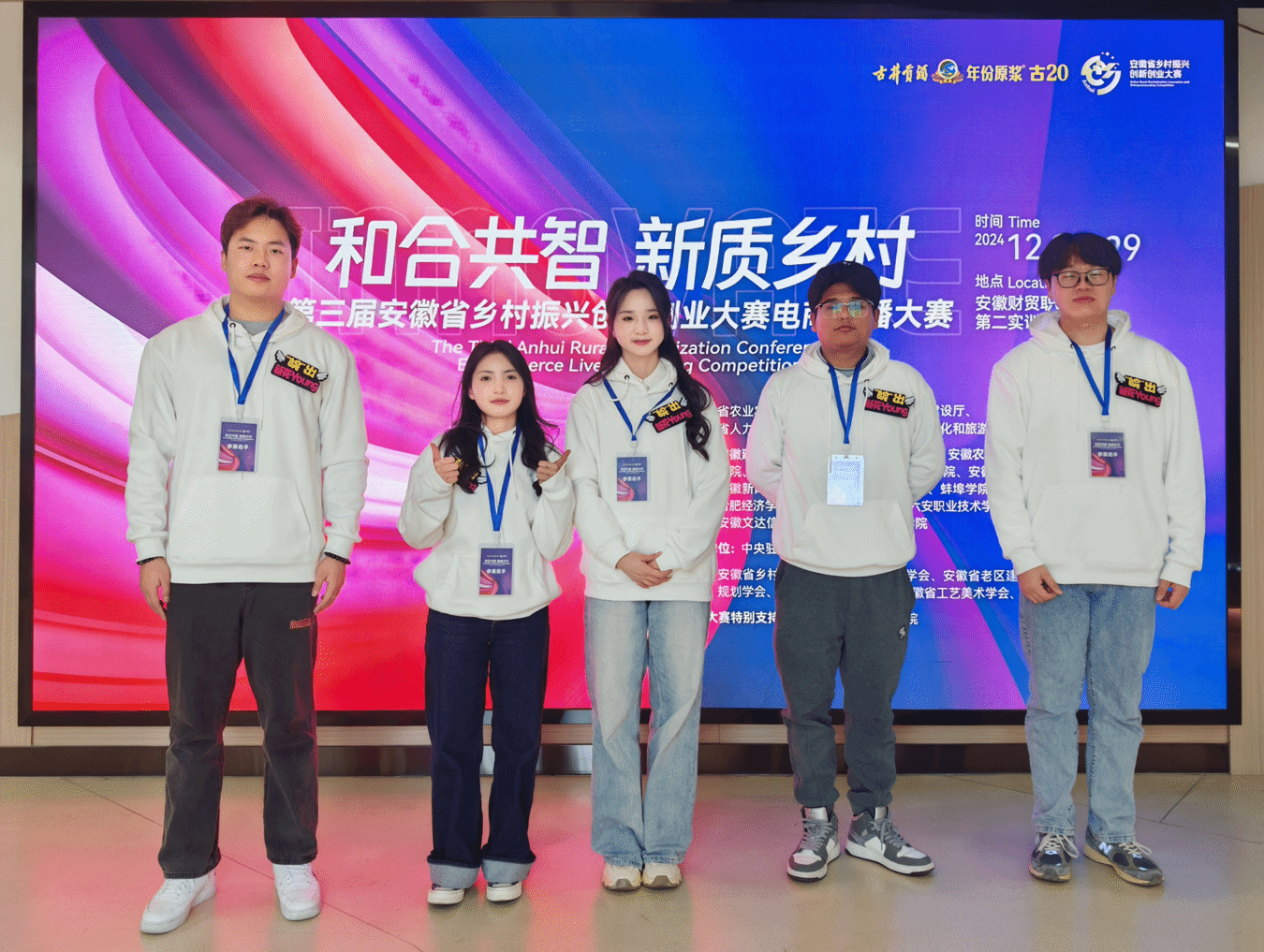 近日,第三届安徽省乡村振兴创新创业大赛评选结果揭晓,今年会官网袁晓薇教授指导的“皖”出新花Young团队斩获电商直播赛道一等奖。团队成员共5人:张六军、王鑫麒、王紫荻、王艳、鲁金健,均来自2024级网络与新媒体专业(专升本)。