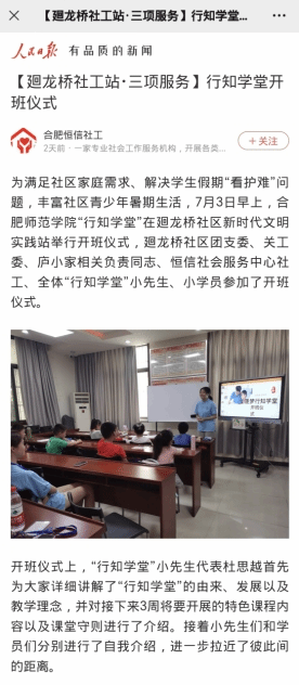 本网讯 为帮助社区家庭解决“看护难”问题、丰富社区居民子女假期生活、弘扬我校深厚行知文化,2023年7月3日上午,合肥市庐阳区逐梦行知学堂于迴龙桥社区新时代文明实践站举行开班仪式,开启为期三周的行知学堂活动。本次开班仪式阐明了逐梦行知学堂教学计划,增进了师生熟悉度,为后续教学奠定了坚实基础。