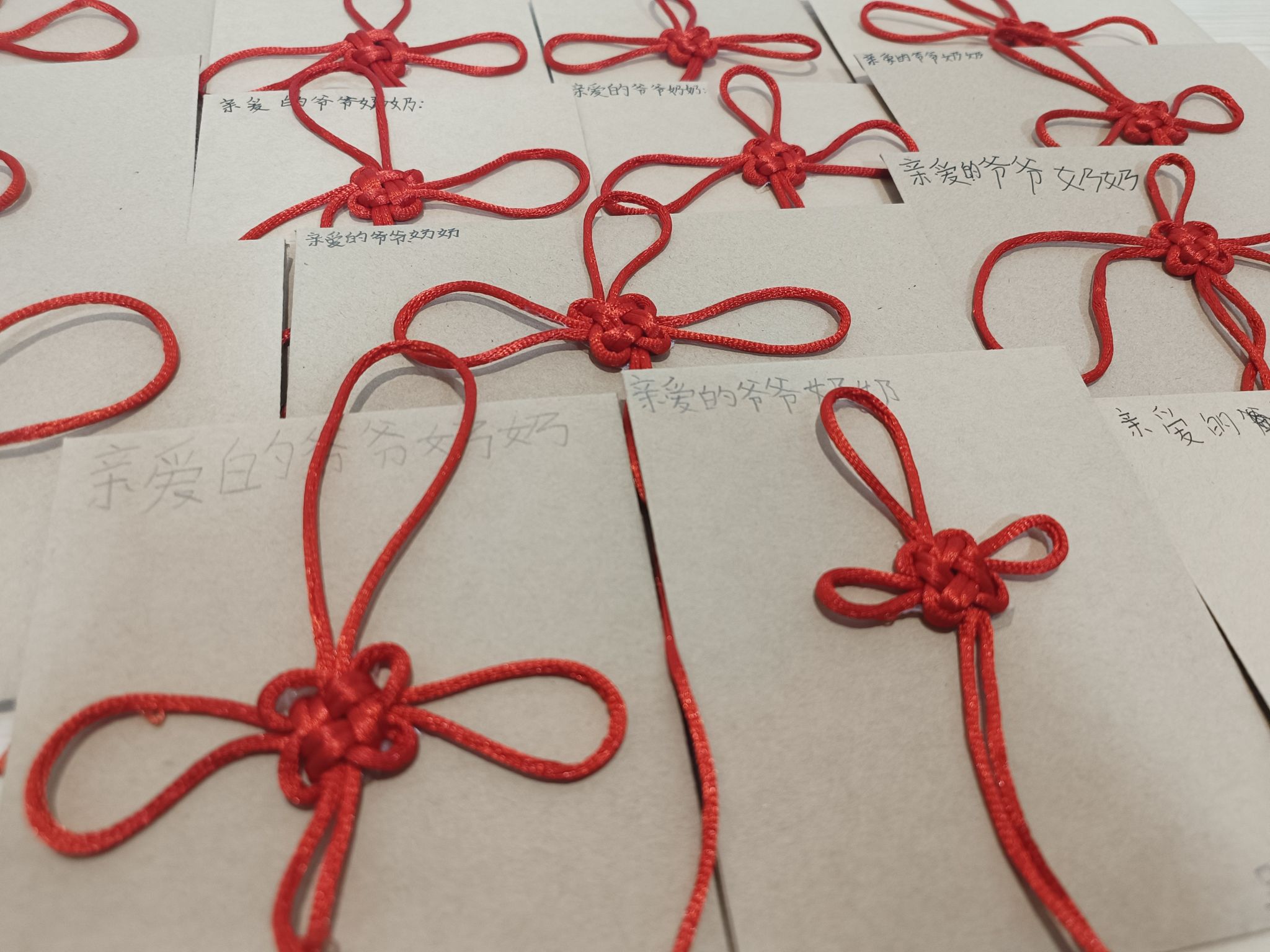 活动前一周,小学员们便在“小先生”指导下开展准备工作。他们用心制作了20余封“中国结家书”,并在“小先生”的帮助下学习平结编织技巧,将红绳编织成吉祥结,粘贴在信封上。“小学员”们边编结边说:“中国结代表吉祥,希望爷爷奶奶健康长寿!”
