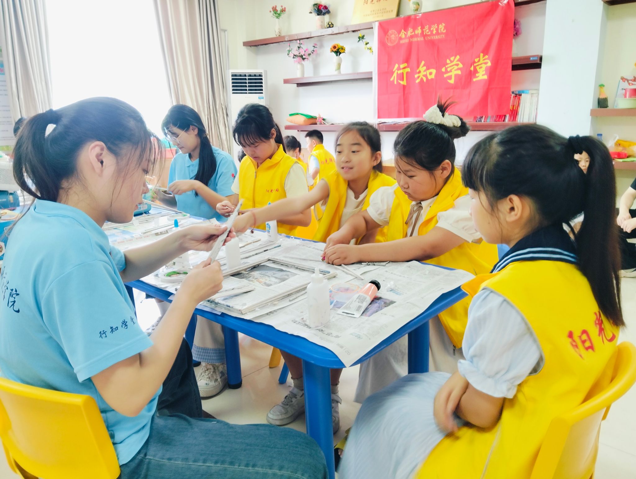 活动伊始,小先生们展示了预先设计好的多种利用废旧纸张制作立体画框的方法。耐心讲解并示范了卷纸筒、折叠瓦楞、纸条编织、拼贴肌理等多种技巧。小学员们在小先生的一对一指导下,兴致勃勃地挑选心仪的废旧纸张,运用剪刀、胶水等工具,发挥想象力将不同颜色、质感的纸片拼贴成独特的背景图案制作画框。活动现场气氛热烈,裁剪声、讨论声、欢笑声此起彼伏。