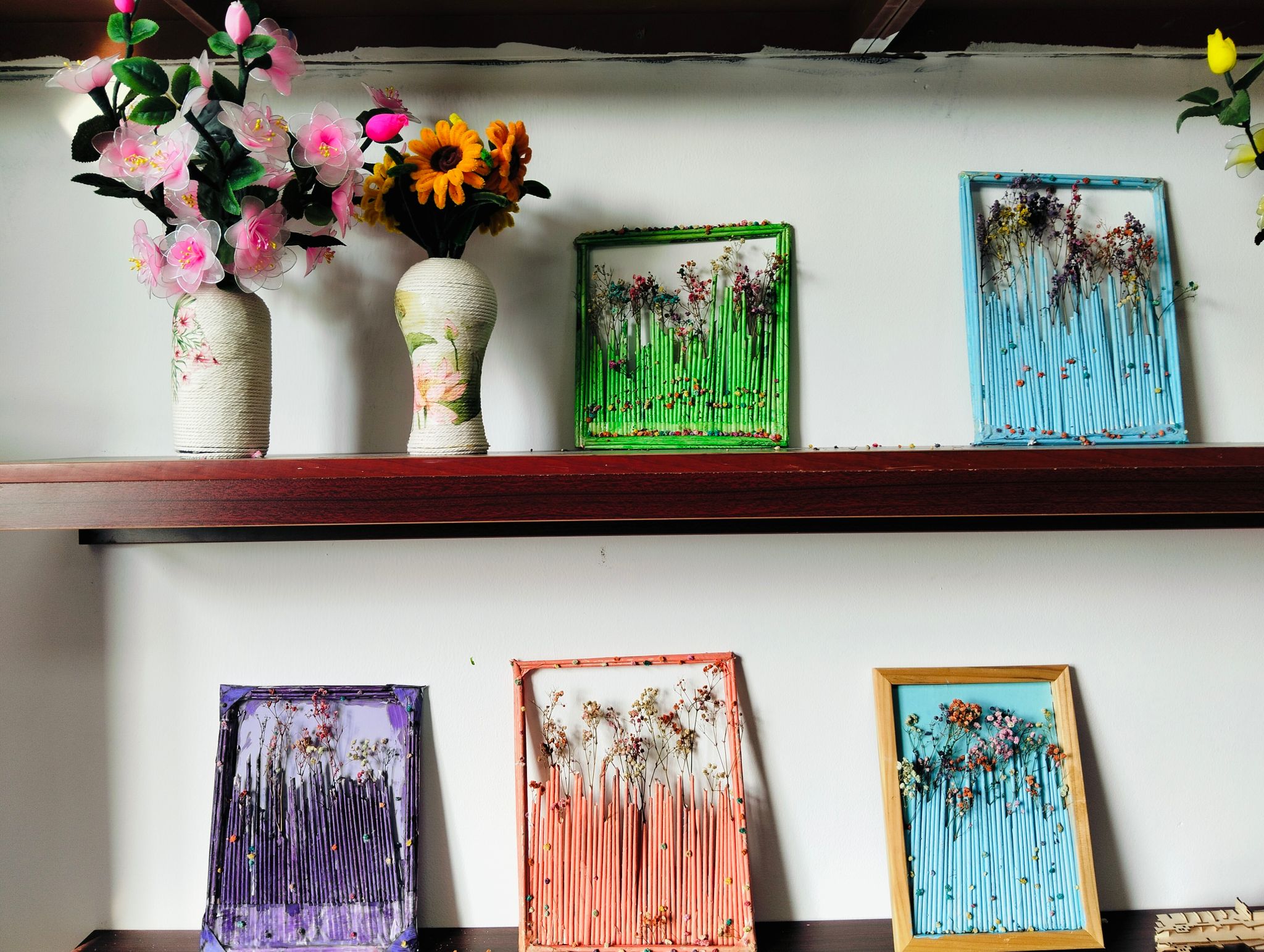 小学员们化身“小小花艺师”,精心挑选干花,在画框的留白处或特定设计区域进行布局。有的选择简约的一枝独秀,有的则偏好热闹的簇拥效果。小先生们在一旁细心指导,鼓励孩子们大胆尝试色彩组合和空间构图。很快,原本朴素的纸质画框在干花的点缀下焕发出勃勃生机与艺术气息,每一幅作品都独一无二,凝聚着孩子们的巧思和对美的理解。