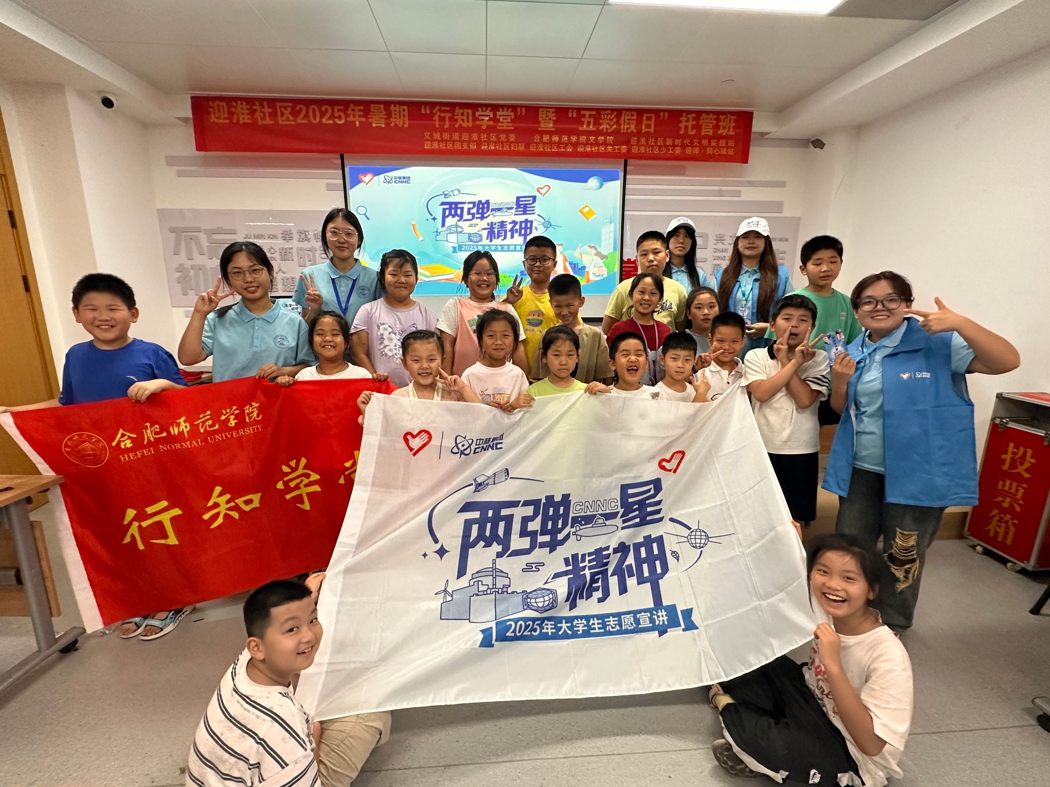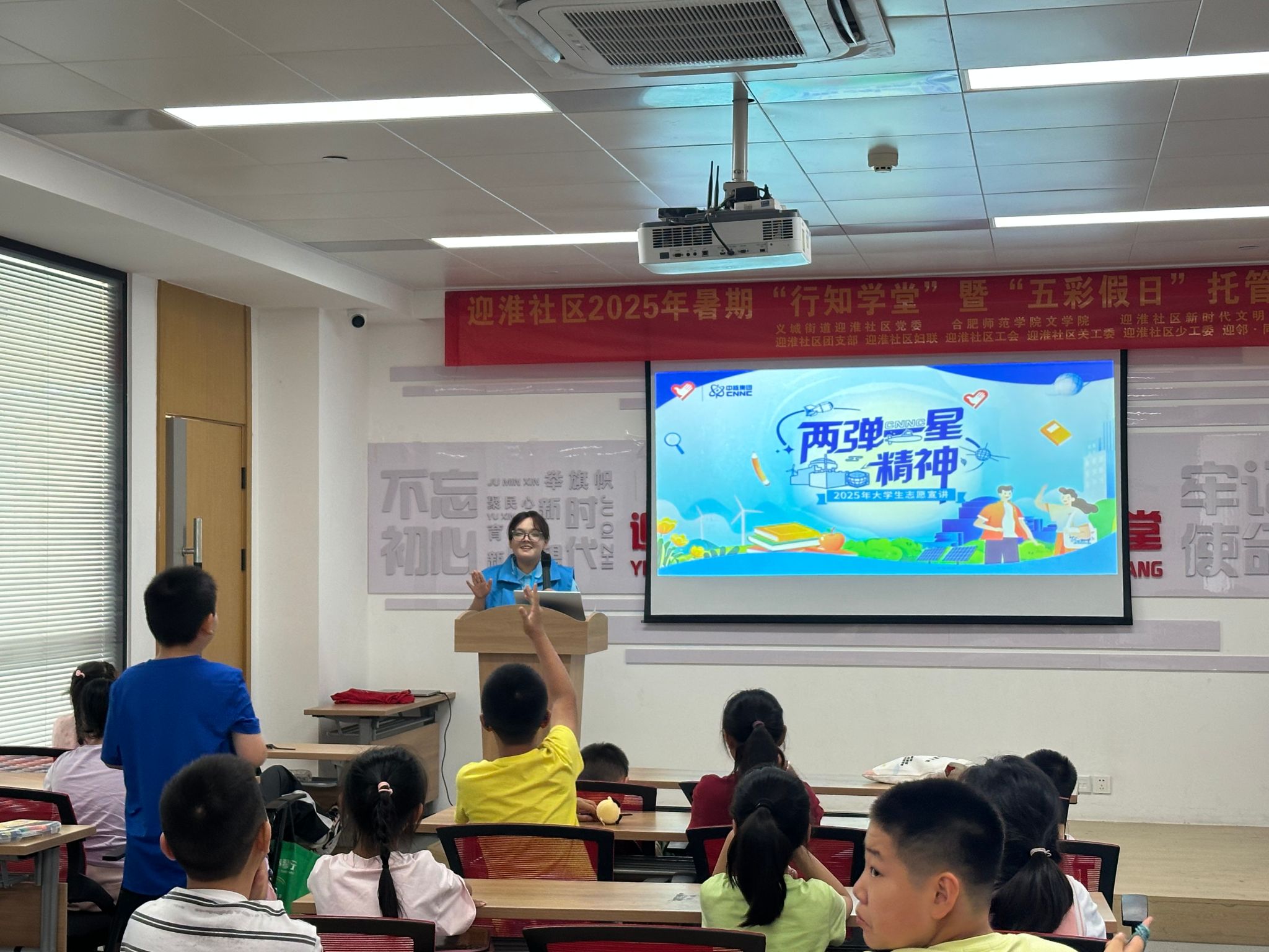7月22日,迎淮社区行知学堂内气氛热烈,团中央青年志愿者指导中心志愿服务项目“两弹一星”精神宣讲团走进学堂,为学员们带来了一场精彩且富有教育意义的宣讲活动,宣讲团成员刘灿和伊巴代提古丽分别围绕生活中的核辐射与“人造太阳”点燃能源梦想展开讲解,为“小学员”们打开了核科学知识的大门。