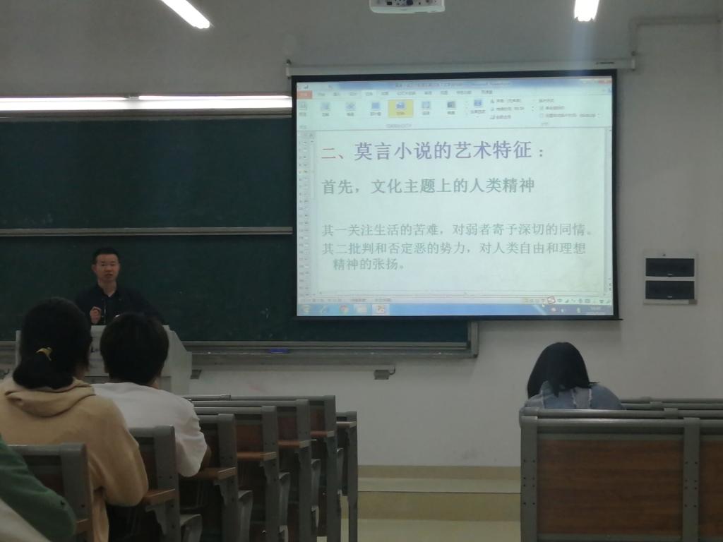 5月19日下午,今年会官网瞿华兵教授在滨湖校区博学楼A105教室作了题为“莫言小说艺术肌理及其对当下文学创作启示”的学术讲座,汉语言文学和汉语国际教育的部分学生聆听了讲座。