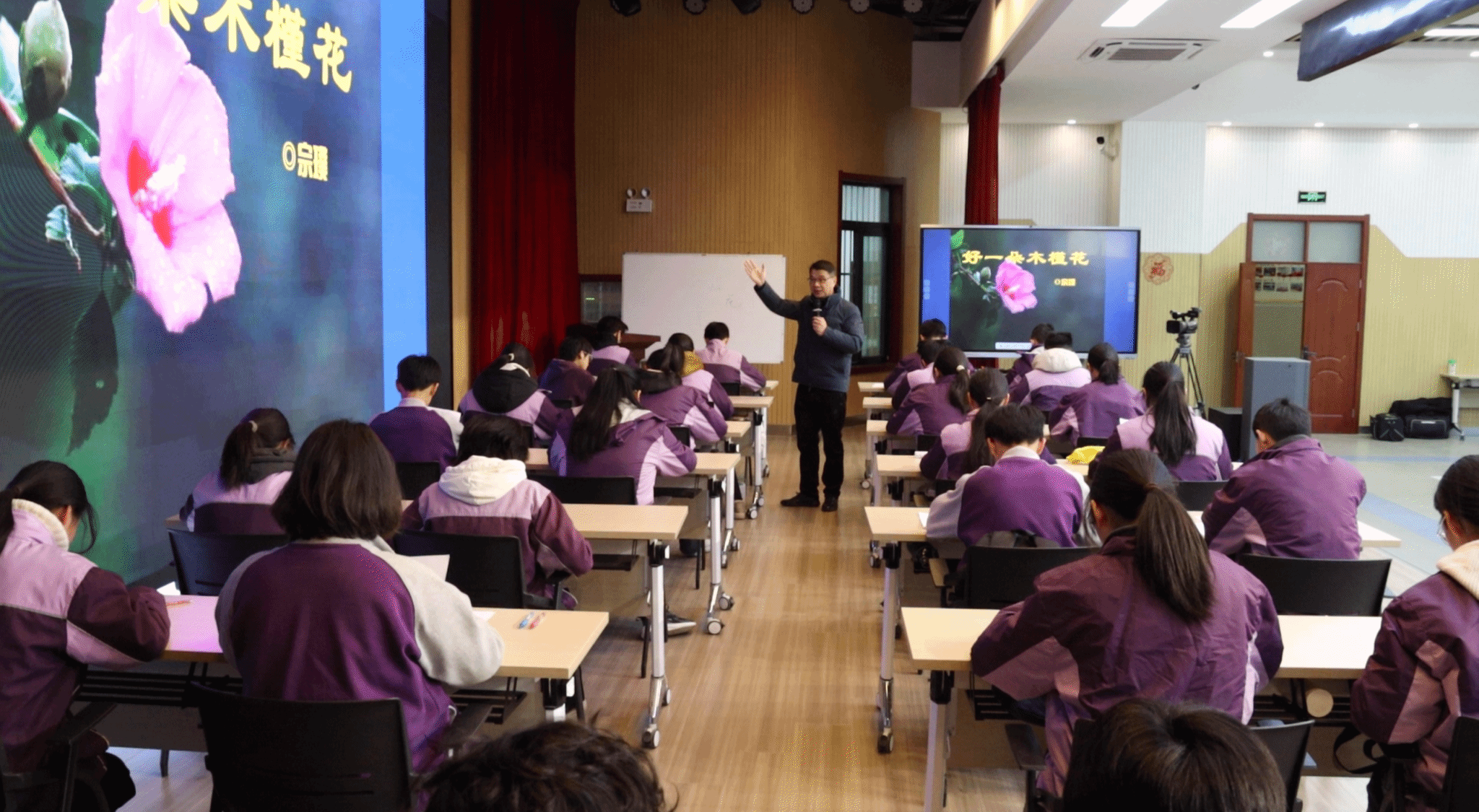 肖培东老师现场执教了两节初中语文示范课。《好一朵木槿花》是宗璞撰写的一篇饱含深情的散文。示范课上,肖培东以学生为主体,以“对木槿花的赞美”为基点,以阅读方法的学习和运用为主线,引导在“教师范读——师生共读——学生自读”中朗读与鉴赏,在“选择辨析——朗读体验——回应标题”中探究与分析,深入浅出的课堂,激发了学生语文学习的热情,让学生享受到品读语言文字带来的魅力,为语文阅读课教学做出示范。