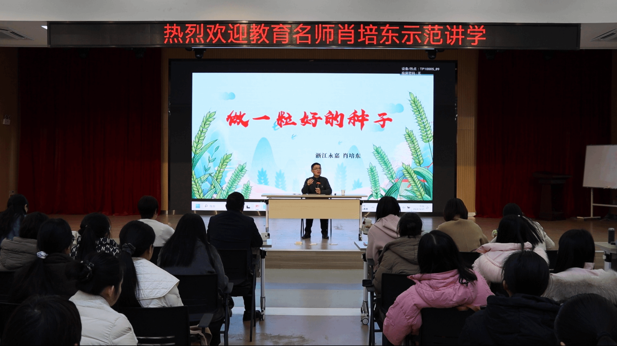 示范课后,肖培东作了题为“做一粒好的种子”的精彩讲座,他引用袁隆平院士的名言:“人就像种子,要做一粒好种子”,分享了自己对教育的独到见解,勉励同学们做具有一颗专业心、阅读心、思考心、写作心和赤子心的“好种子”。他指出,语文教学要以“语言运用”为本,培养学生过好“语言生活”的能力,呼吁语文教学少一点概念化的讲解,多一些文本的感受与解读,坚守住语文的本质,以确保语文教学不走偏、不走样。