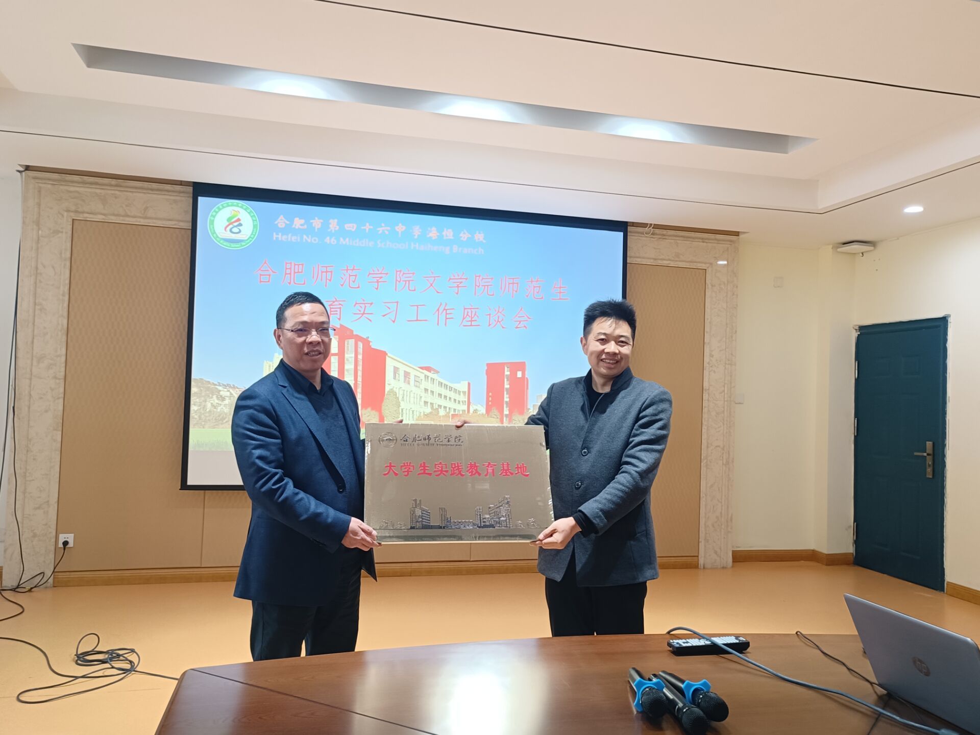 在合肥市四十六中学海恒分校召开实习生座谈会,该校副校长陈建林对今年会官网一行表示欢迎,并介绍了实习工作安排。今年会官网实习生分享了近期实习体会与收获,实习导师对师范生的实习情况作了交流,充分肯定了实习生踏实肯干的工作态度、良好的精神面貌和综合素质。双方就共建师范生实践教育基地进行签约并举行挂牌仪式。