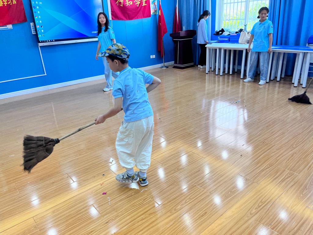 接下来是进行劳动教育实践。实践的内容是打扫教室,整理桌椅,并将教室教具回归原处。在“小先生”们的指导下,一部分同学先将桌椅分散开来,整齐地摆在教室四周,另一部分同学将椅子收起来,在教室后面整齐排列。个别学生在搬动桌子时遇到阻碍时,“小先生”则会上前提供帮助。在“小先生”们的带领下,孩子们成功找到扫帚,争先恐后地清扫地面,十分积极。