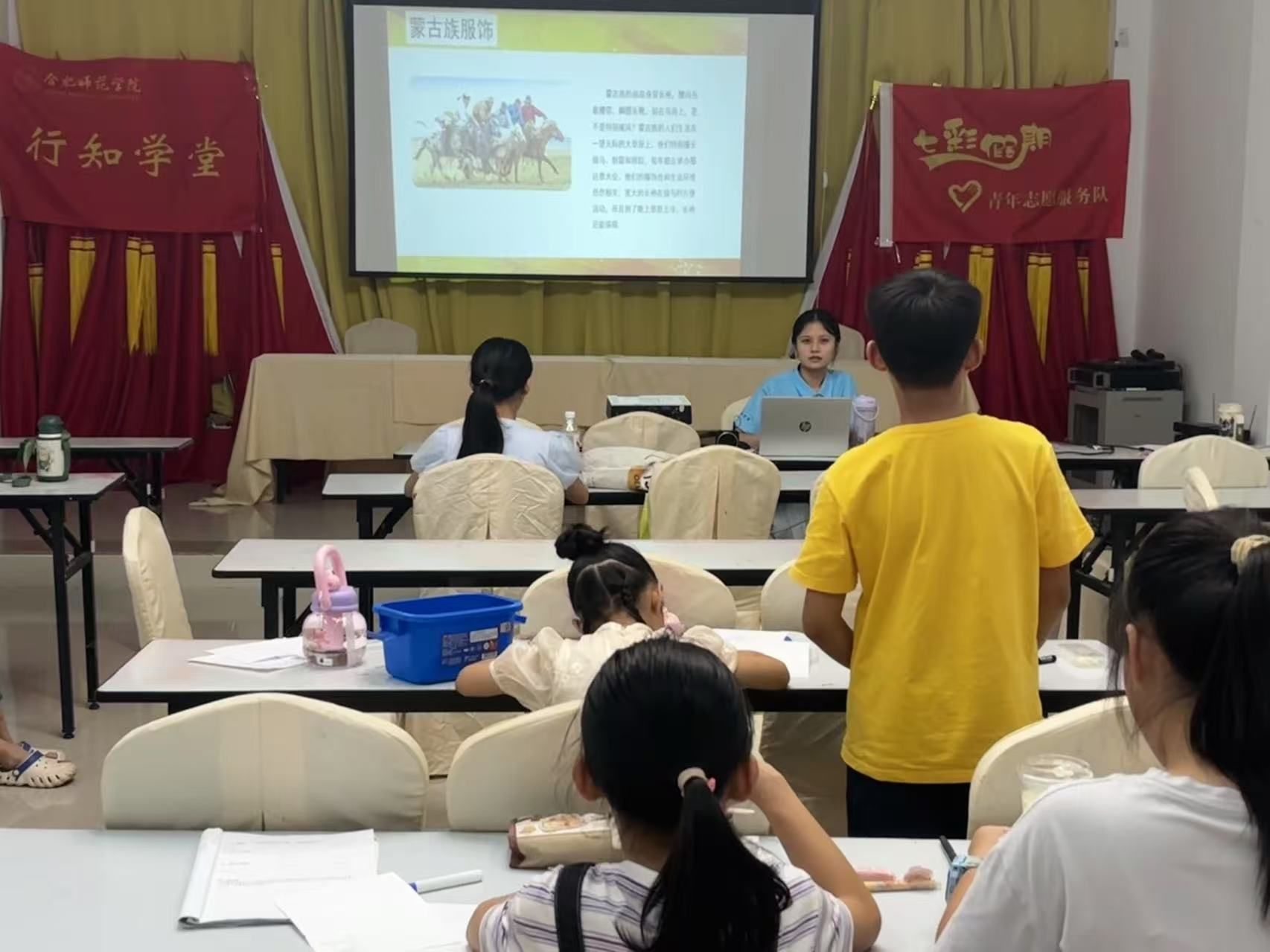 “哪个民族的服饰以银饰为美,素有‘花衣银装赛天仙’的美誉?”““藏族同胞穿藏袍时为何常将一只袖子脱下?”课堂伊始,作为2023级美术与设计学院服装与服饰设计专业的主讲人“小先生”孙一凡便抛出趣味问题,瞬间点燃课堂气氛。孩子们高高举起的小手如雨后春笋,抢答声此起彼伏,清脆的童音里满是对民族文化的热忱。