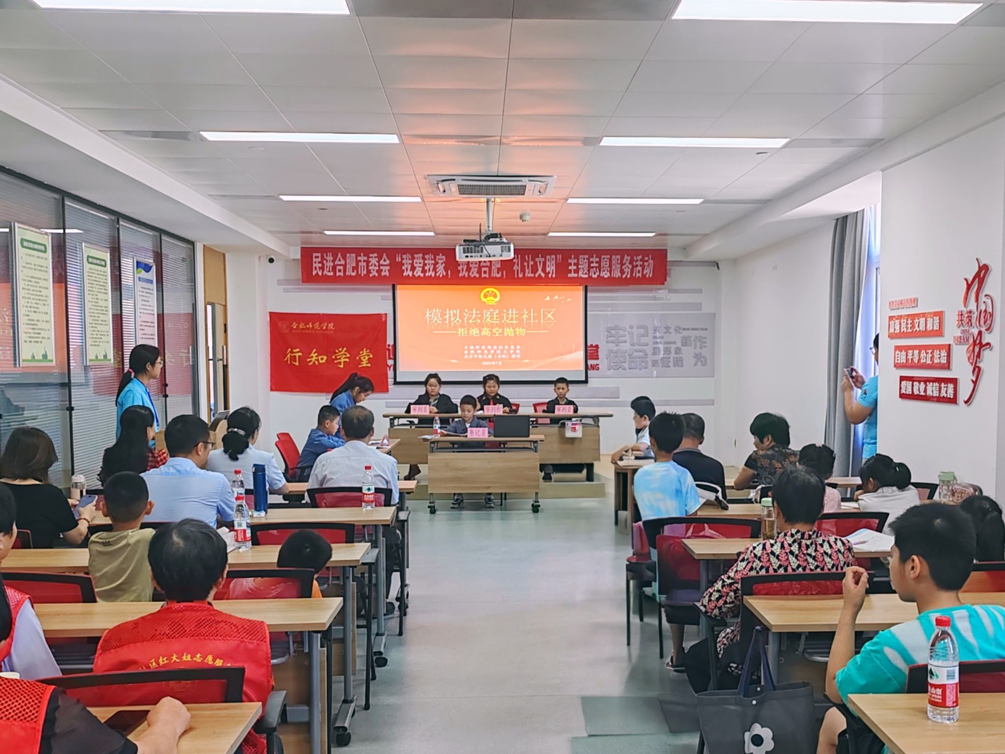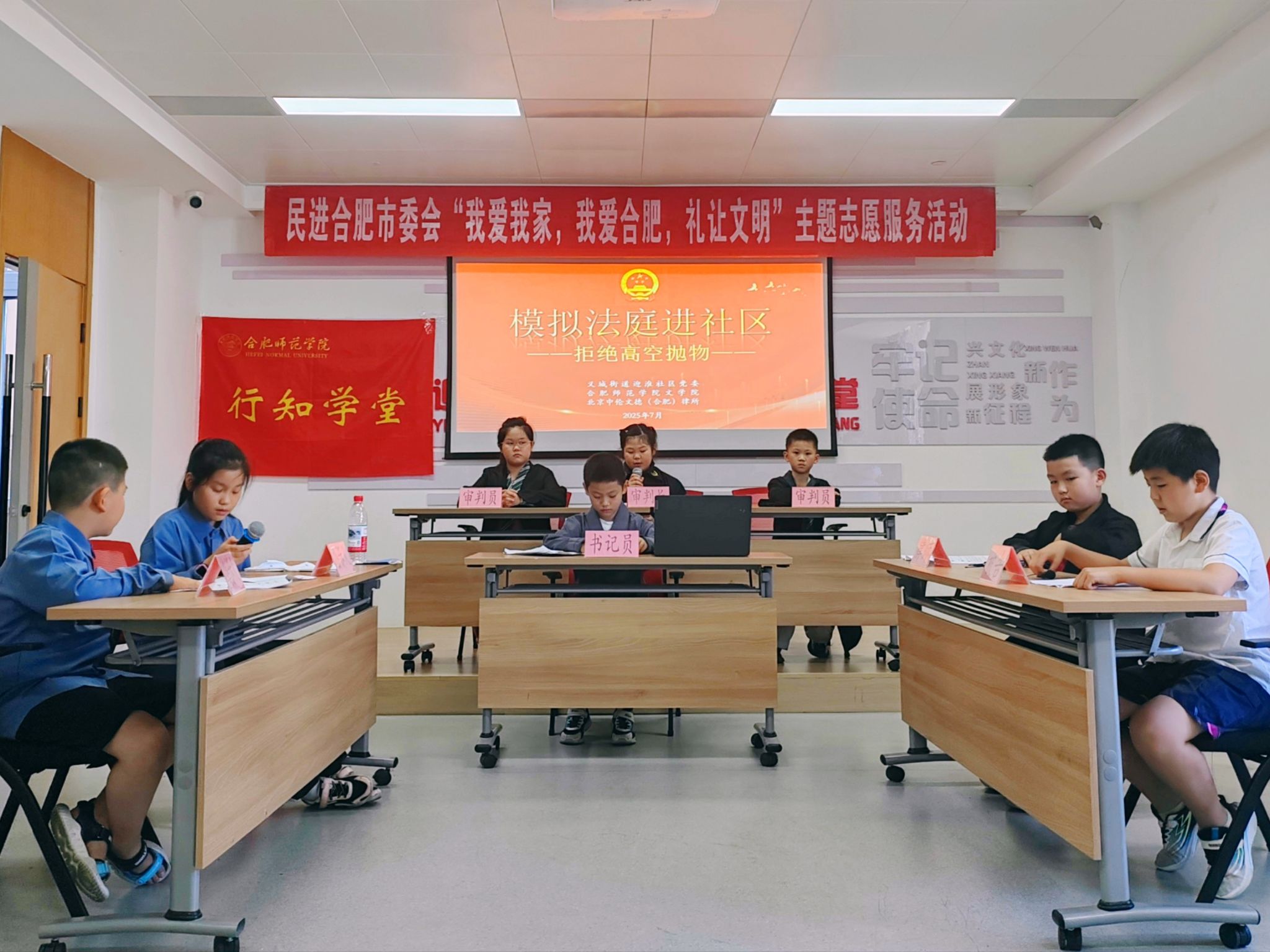 为深化“我爱我家,我爱合肥,礼让文明”主题实践,筑牢青少年法治防护网,7月24日,合肥市包河区义城街道迎淮社区党委携手民进合肥市委会、民进包河总支,在迎邻·同心驿站“行知学堂”暑期托管班开展了一场沉浸式法治教育活动。通过“高空抛物模拟法庭”实战演练与“校园防欺凌”专题宣讲,为50余名青少年及家长送上暑期法治“营养餐”。